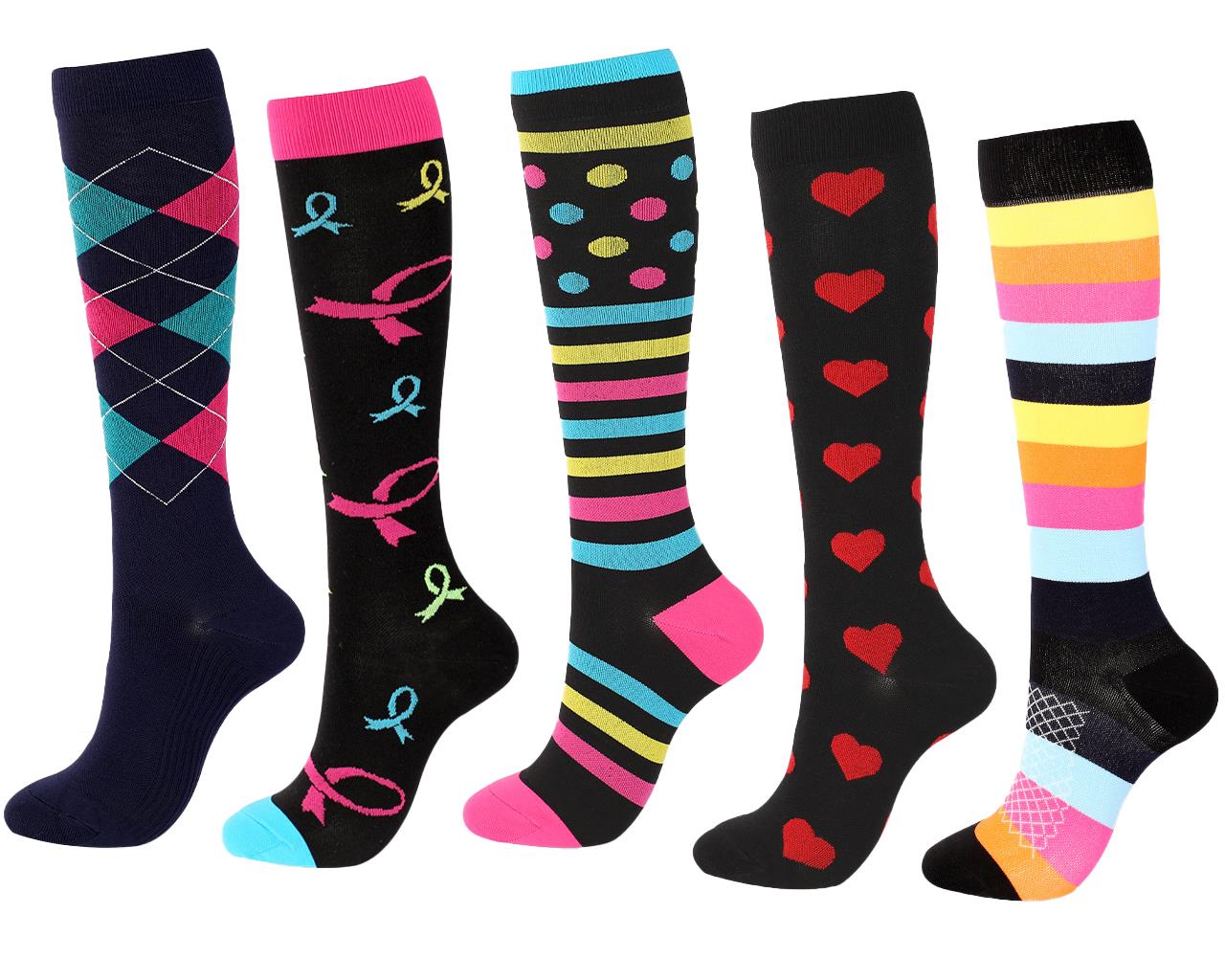 Colourful knee-high socks with graduated compression to improve blood circulation.