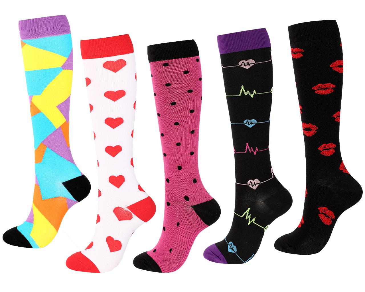 Colourful knee-high socks with graduated compression to improve blood circulation.