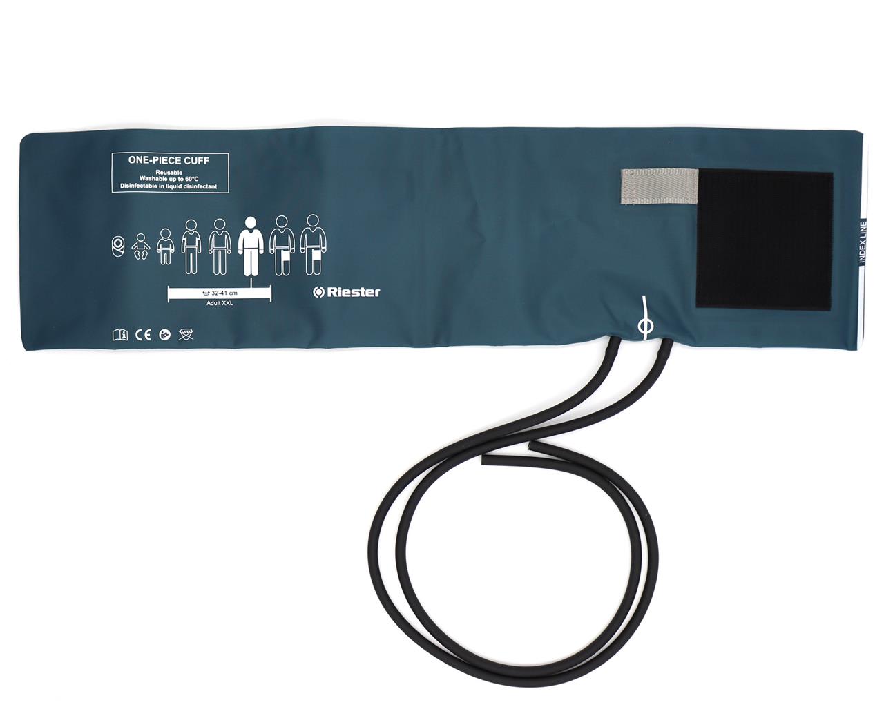 Riester one piece cuff 2 tubes for the blood pressure measurement on adults. The cuff is dark green and has a Velcro closing, reusable up to 10.000 times and washable at 60°.