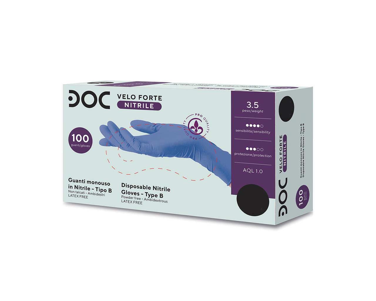Disposable nitrile examination gloves, powder free and latex free. Veloforte model is particularly sensible and elastic. Suitable for end users with sensivle skin, medical, labs, final industry use. It assures a great protection. Light blue.