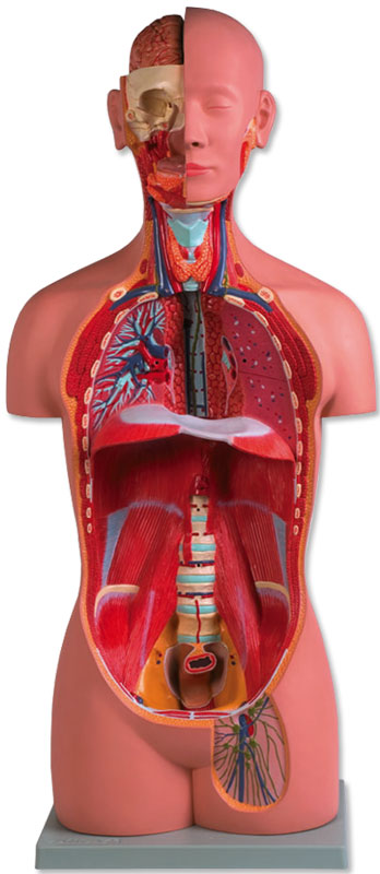 This life size sexless torso, composed of 16 parts, is appropriate for any human anatomy course. All of the major organ systems are represented with great attention to accuracy and detail.
