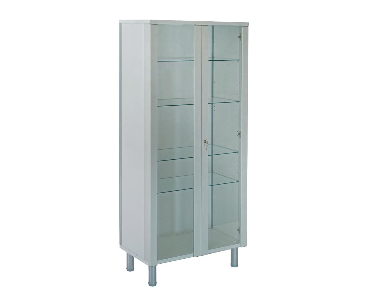 With 2 doors with powder-coated aluminium edges with 5 mm tempered glass that rotate on 180° hinges with lock, 4 adjustable shelves made of tempered glass and, at the base, 4 powder coated steel feet with adjustable plastic insoles, 200 mm height, to facilitate cleaning.