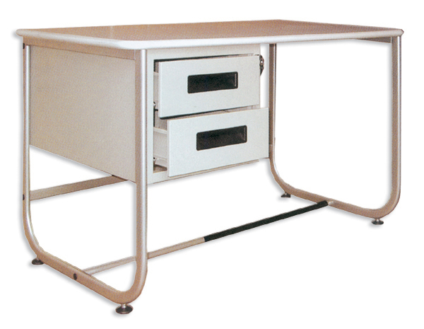 Desk with 2 side drawers with locking top drawer and enamelled tubular steel frame.