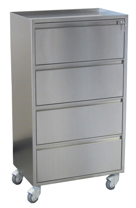 Top drawer lockable, upper shelf with safety edges to carry instruments.