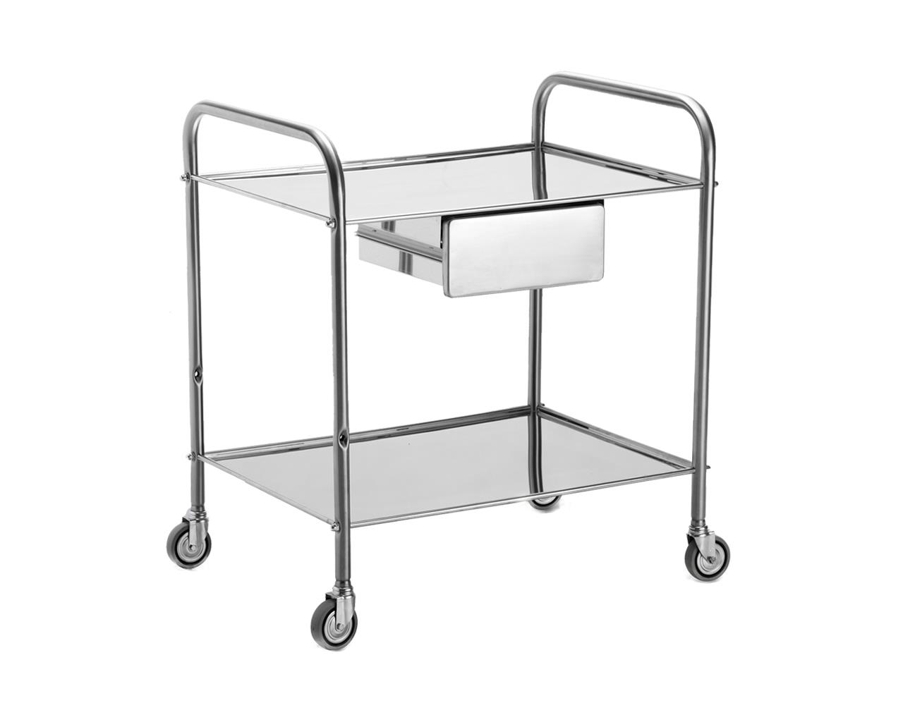Stainless steel trolley with 2 shelves and a drawer, mounted on wheels from Ø 80 mm.