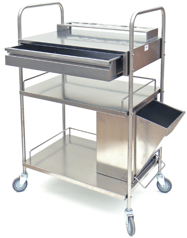 Complete stainless steel dressing trolley. Supplied with 3 shelves, waste bin, drawer, support for bottles, guard rails on the two bottom shelves, 4 wheels (2 with brakes) Ø 100mm.