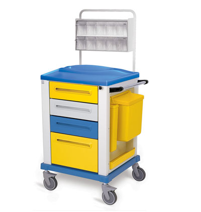 This multifunctional professional trolley has painted steel structure and external plastic finishing. Provided with 4 drawers, one lateral basket and one extra lateral table. Four revolving rubber wheels 125 mm.