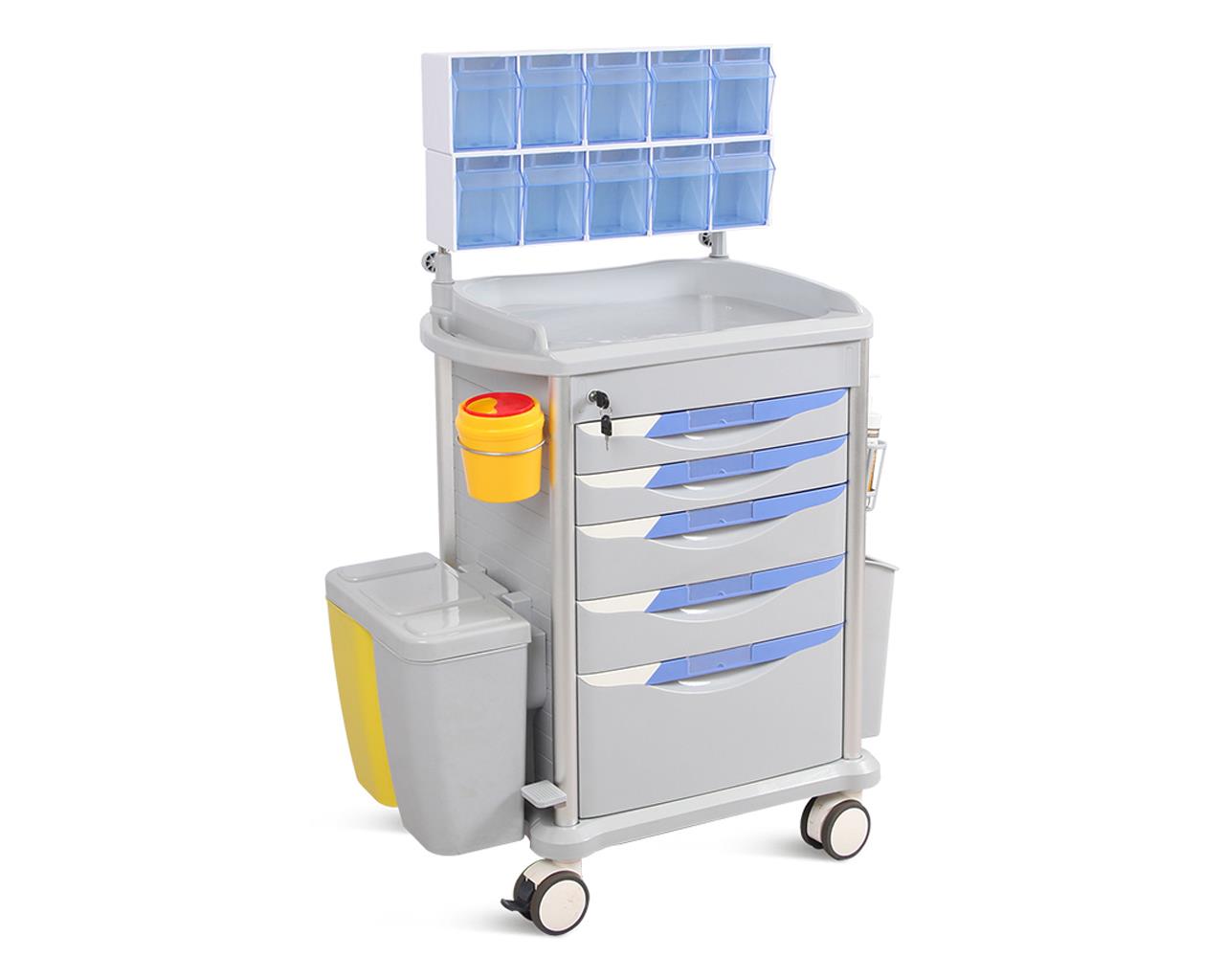 Anesthesia trolley made of ABS and antibacterial materials externally, while the internal structure is composed of steel and aluminium. It is equipped with five big and deep drawers with dividers and four anti-static castors,two with brake.