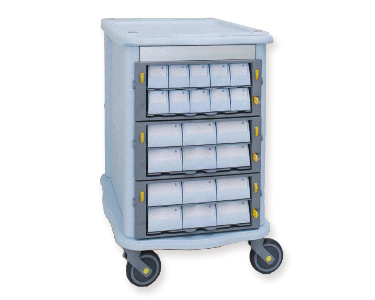 Aurion Mini 400 is a pharmacy trolley with 3 large drawers on one side and 22 (6+6+10) single-dose drawers on the other side, complete with locking system and 4 swivel wheels, 2 of which with brake.