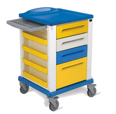 This multifunctional professional trolley has painted steel structure and external plastic finishing. Provided with 4 drawers, one lateral basket and one extra lateral table. Four revolving rubber wheels 125 mm.