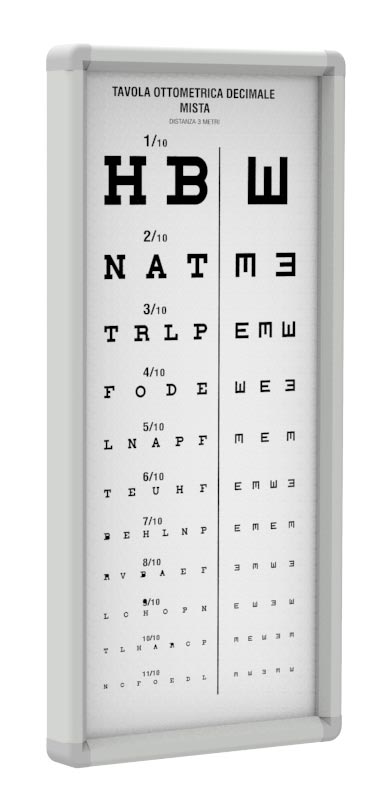 Optometric chart: Mixed decimal - 3 m not illuminated . It has been designed according to clinical recommendations for an extra white light to give an accurate and precise reading of any detail. Manufactured with acrylic screen, and according to safety norms (fuses, Shuko plug, green light On/Off,...).