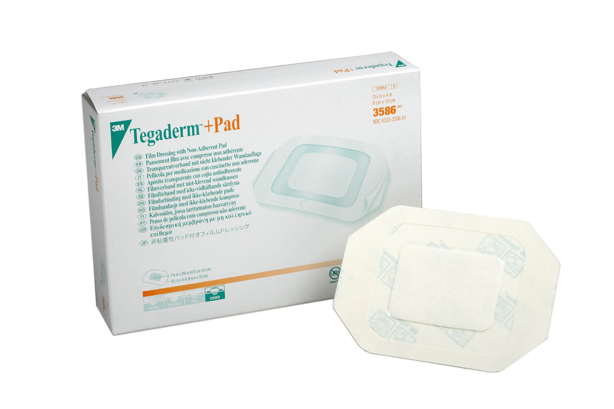 Original 3M medication products 3M TEGADERM™- PAD, sterile transparent dressing with label.