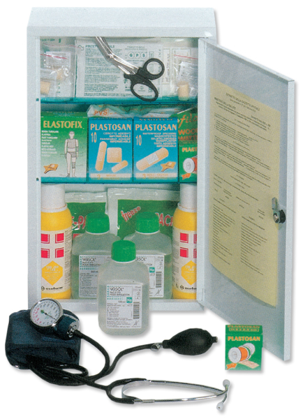 Metal cabinet advised for offices of 10-30 people. Meets Italian law 81/08.