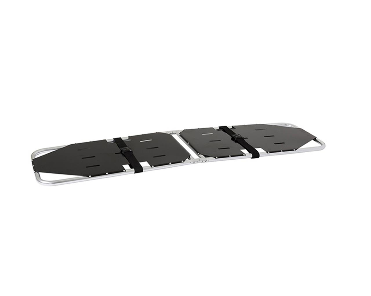 Foldable emergency stretcher made of high strength aluminium alloy. Lightweight, small-sized, easy to carry and sterilize.