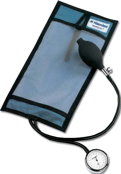 Pressure cuff for infusion with high quality chrome-plated gauge to allow monitoring of blood pressure during infusion, also incorporates safety-valve. Sturdy blue cotton cuff washable at 60°, latex free. Made in Germany.