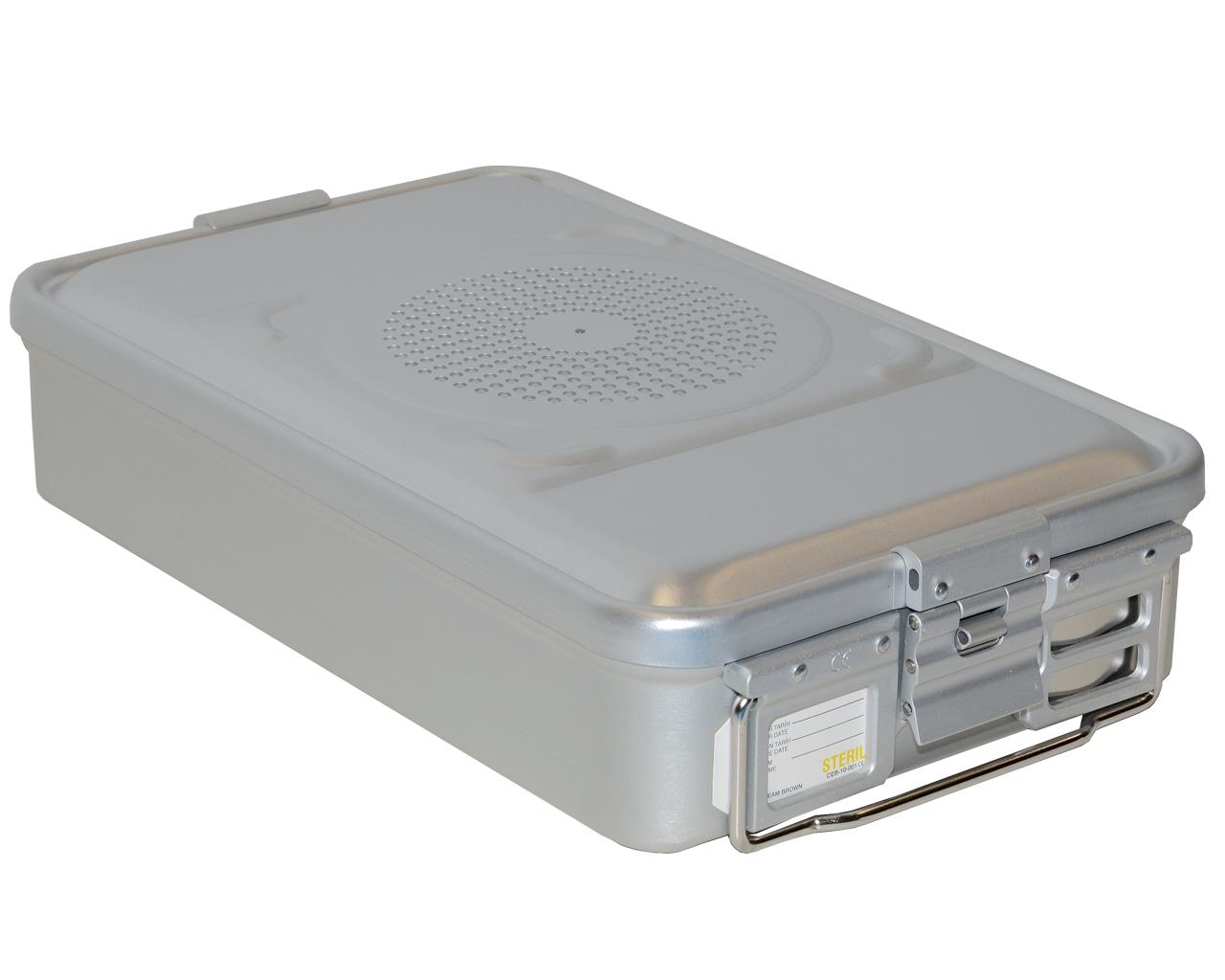 Sterilisation container with one filter and non perforated bottom. Autoclavable at maximum 134°C and 2.2 bar.