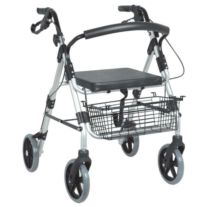 Silver rollator foldable with seat, large front basket and brakes on rear wheels.
