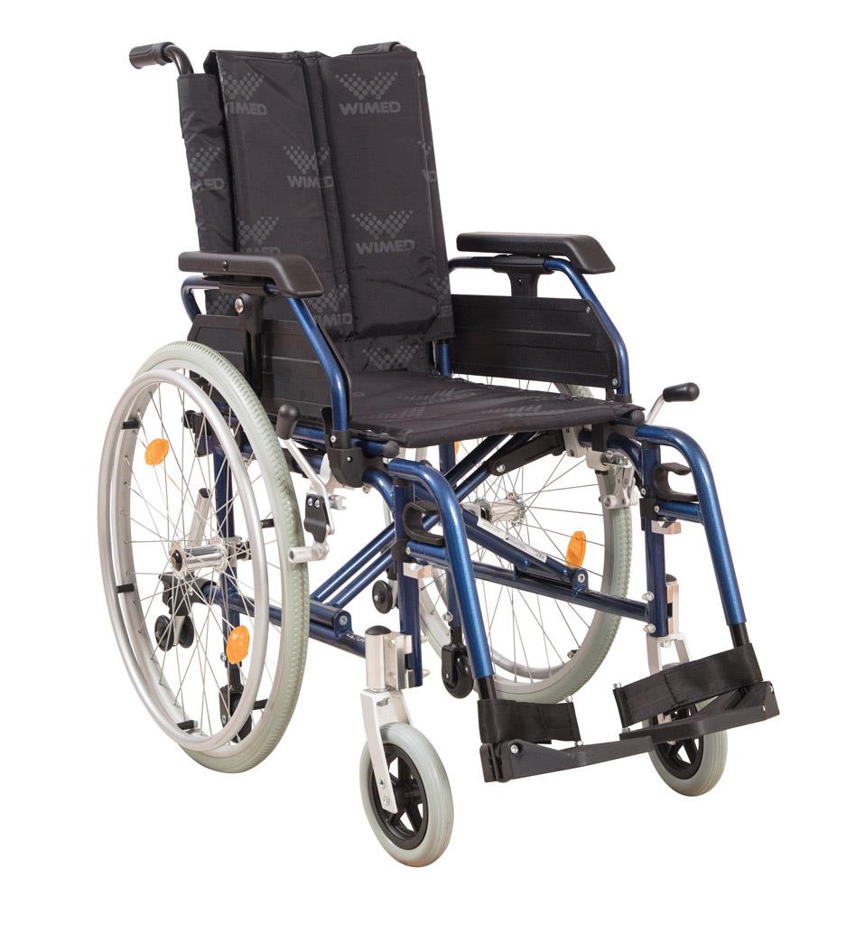 Lightweight and foldable self-propelled wheelchair with double cross frame. This wheelchair offers height-adjustable padded and reinforced tensioning backrest, numerous center of gravity adjustments, tilt-adjustable forks, castors for narrow passages and anti-tip as standard.