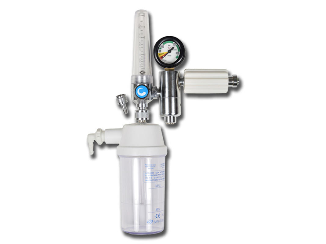 Pressure reducer with valve and H.P. manometer with adjustable ball flowmeter 0-15 l/min and autoclavable humidifier apparatus to be connected with cylinder valve.